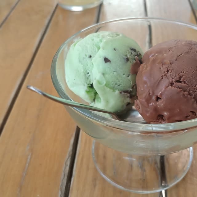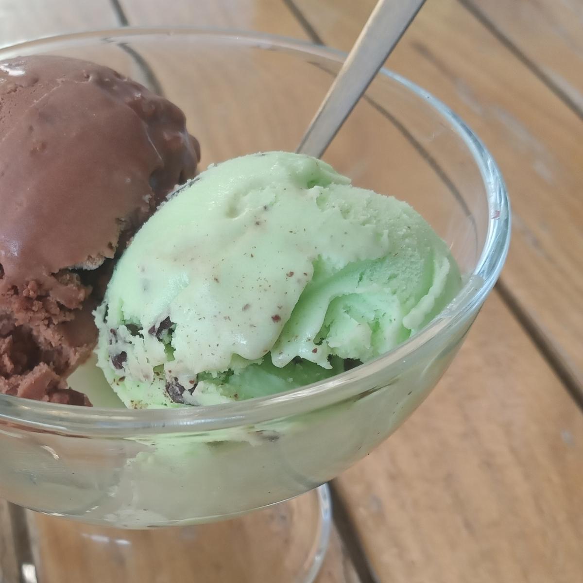 Bola de helado de menta con pedacitos de chocolate negro. Me gustó, aunque me supo a poco porque hubiera querido más. Hoy en día, por fortuna, hay opciones éticas para todas las cosas especistas que nos enseñaron a usar y comer, ya no tiene sentido seguir matando indiscriminadamente, si es que alguna vez lo tuvo.
