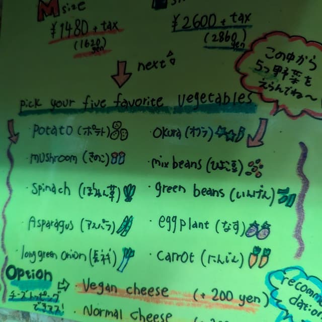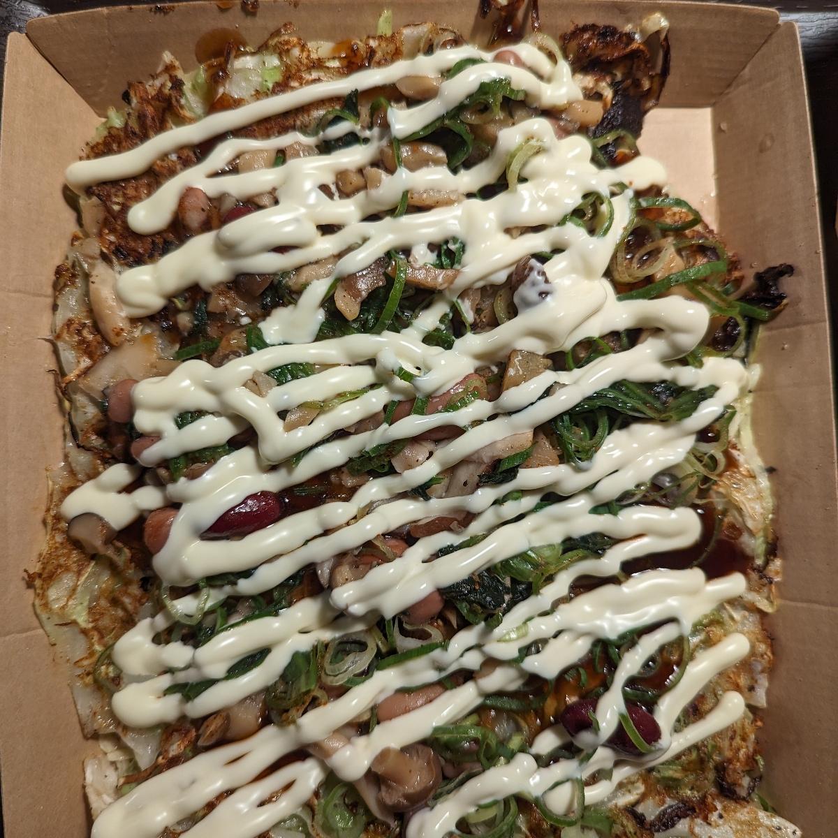Loved this veganized local dish! Made with cabbage and a soy pulp for the base, you can choose to add five veggies on top. There is a BBQ style sauce that has a great flavor, and optional vegan mayonnaise (loved it) and vegan cheese. The medium size is a LOT! Even my hungry husband found it filling, especially with some sides. There is definitely a good chance for a long wait, but there is a self service bar inside where you can make a mixed drink or pour a beer to enjoy in line on the street 👌🏼. The whole restaurant has cool vibes and is a fun environment, so the wait honestly didn't seem that bad. Food is definitely worth it, and we were so thrilled to find a veggie loaded dish!