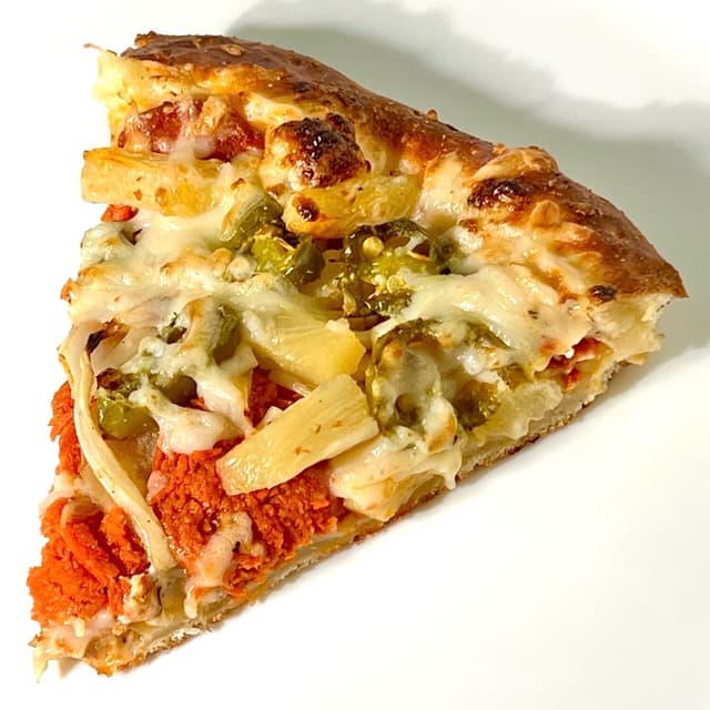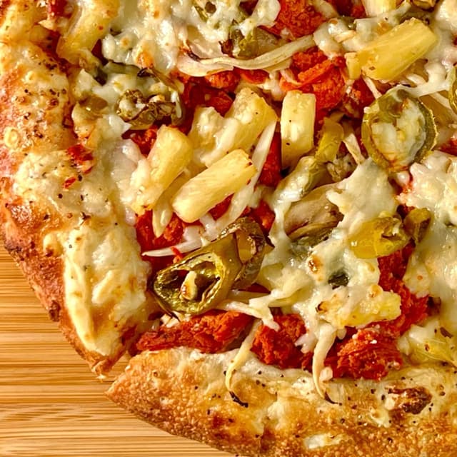 This consisted of black pepper, pineapple 🍍, onions, jalapeños, vegan pepperoni, and melty Follow Your Heart 🐮🥛-free mozzarella on Rudy’s rich and creamy vegan Alfredo sauce. The combination of meaty, cheesy, creamy, sweet, and 🔥 in the generous layer of toppings on a wonderfully chewy crust was delicious and satisfying.