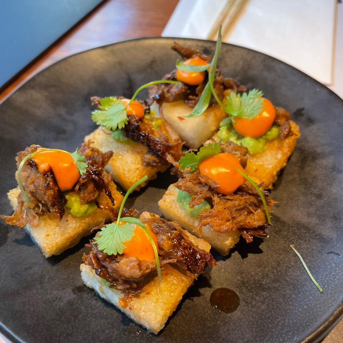 Buoni, quadratini di riso fritto con sopra i funghi shiitake, piccantino