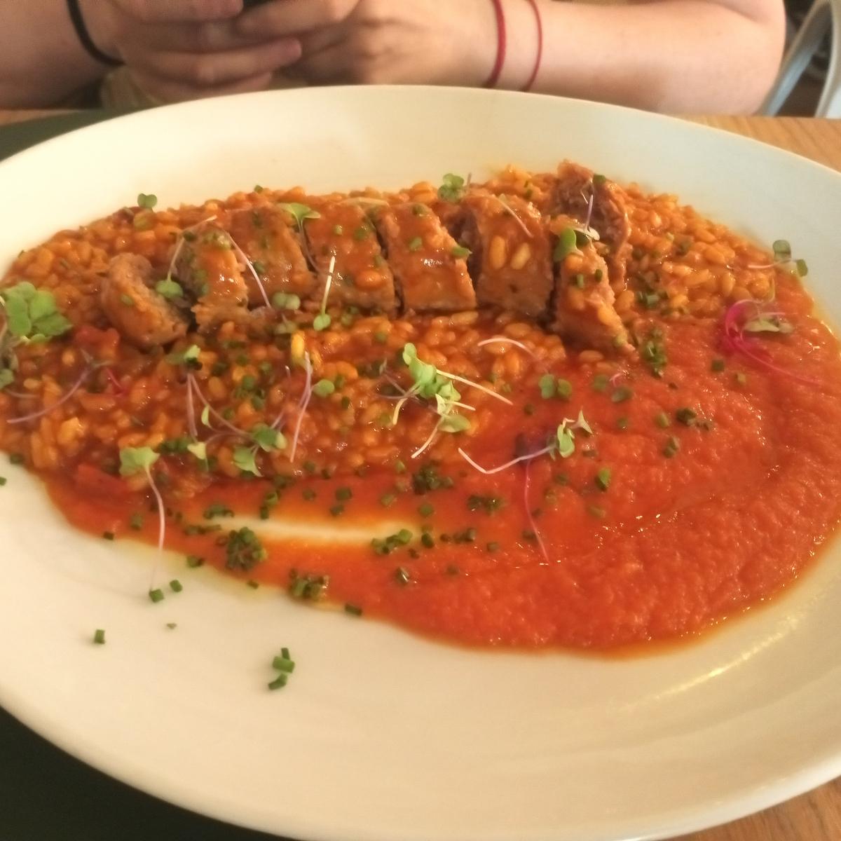 Arroz a la catalana con butifarra: Arroz meloso con sofrito de verduras, azafrán y butifarra beyond meat. El arroz muy bueno y la butifarra beyond espectacular. 10 de 10 especistas no notan la diferencia entre este plato plant-based y el ordinario hecho con cadáveres descuartizados de animales torturados. 13,95 €