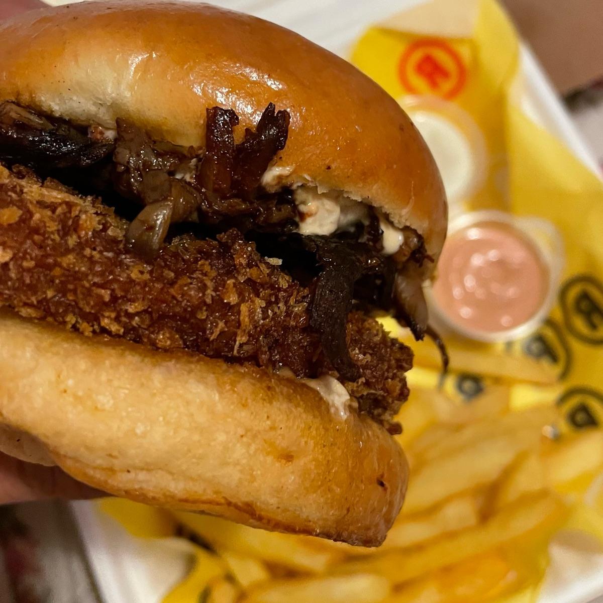 Deliciosaaaa. Crispy burger con salsa anticuchera + pancita y rachi. Viene con ocopa pero pedí que no le pongan porque no me gusta 😅