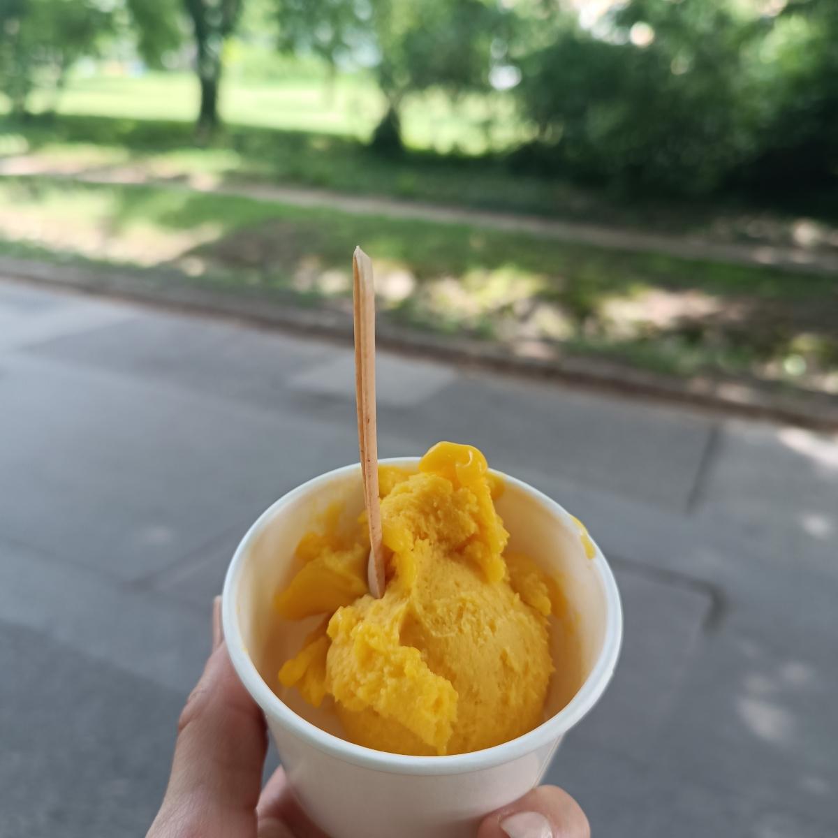 🌱 In Gödöllő, in the courtyard of the Kútház café, there is a small container with a cute ice cream counter. They have a variety of gluten-free, egg-free, milk-free and vegan ice creams, of which I chose the mango. 🍦