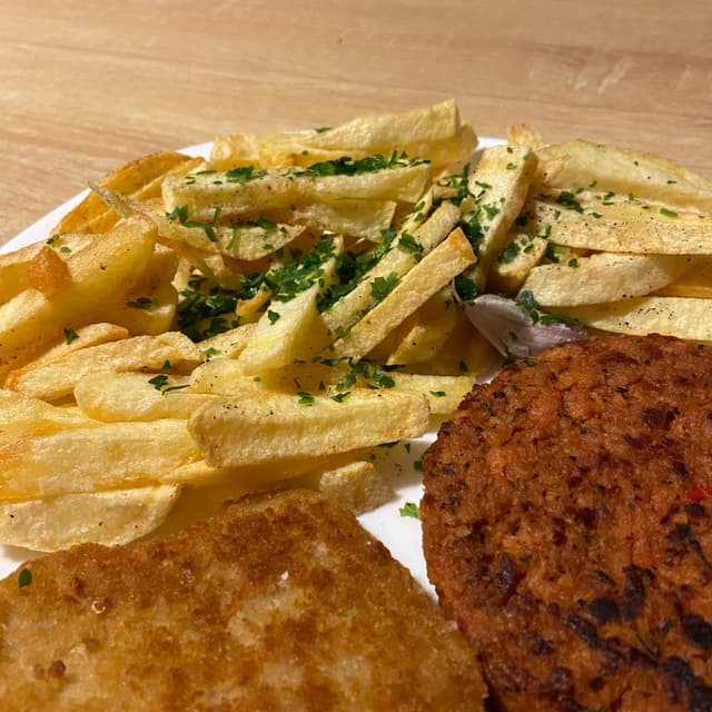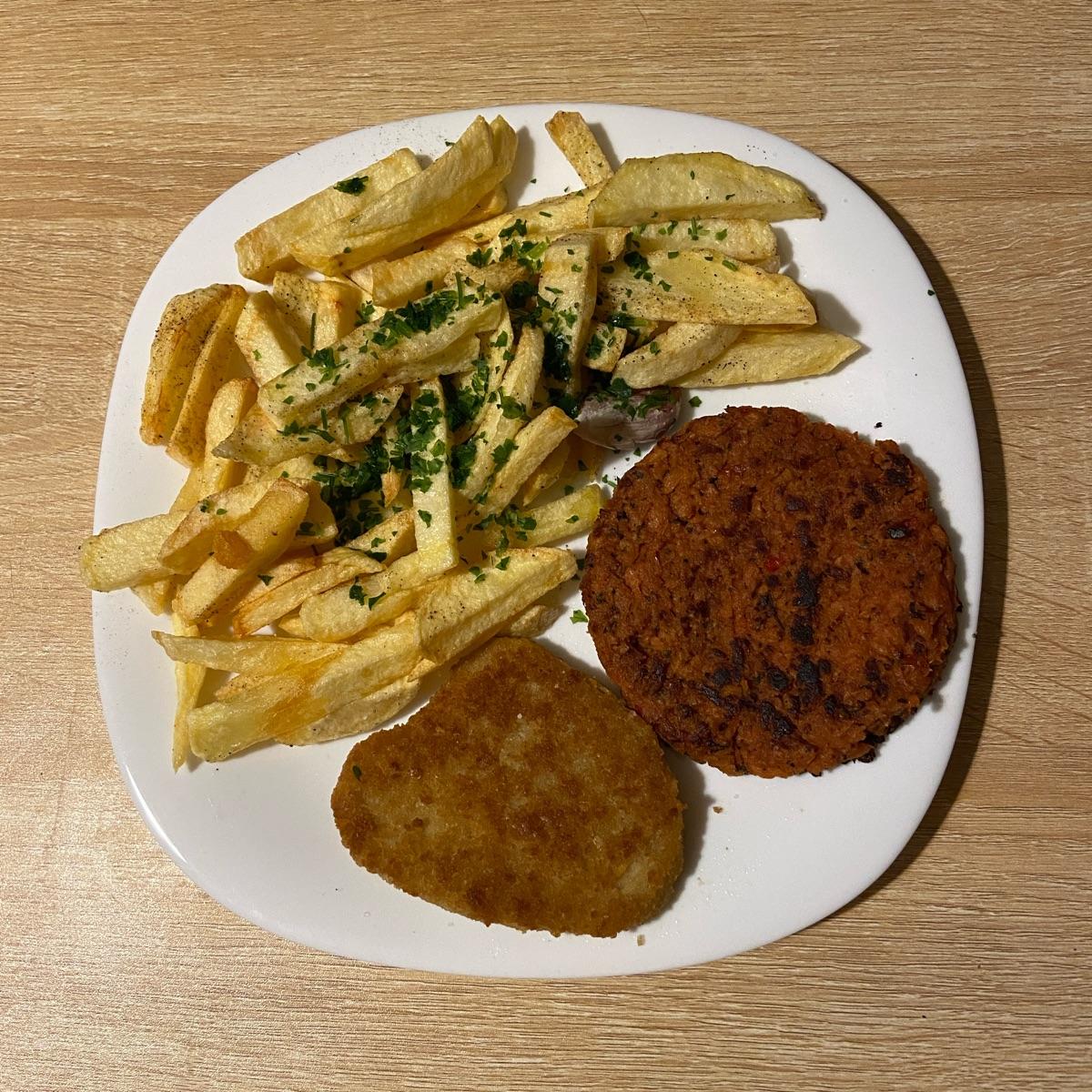 El escalope de BETTER BALANCE acompañado de patatas con la hamburguesa, que ya subiré en otro publicación de que marca es, un plato sencillo para salir del paso ;), esto ya si lo acompañas con un buen gazpacho…🫠🧡🌱