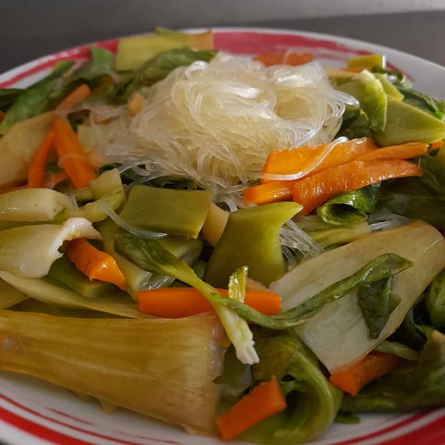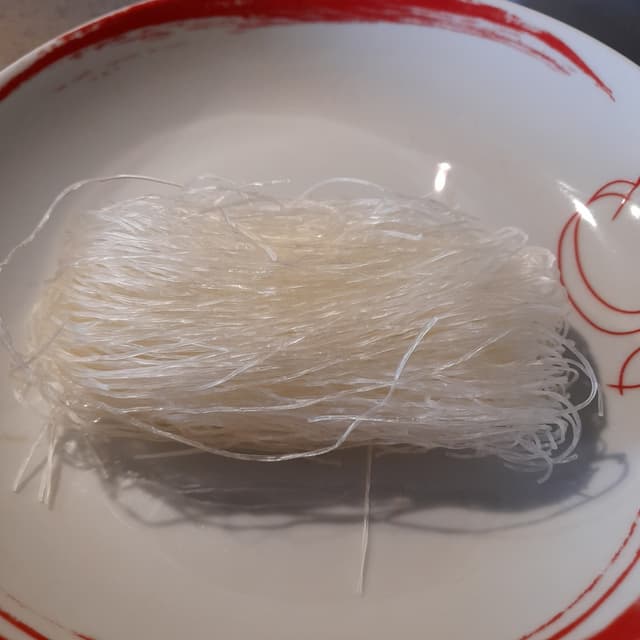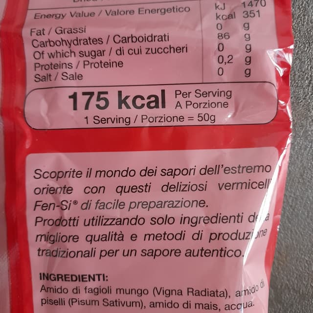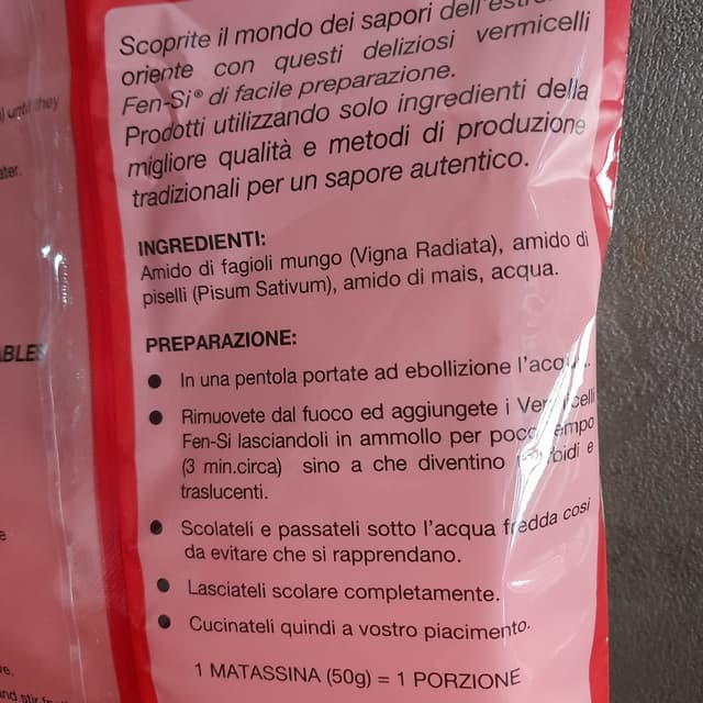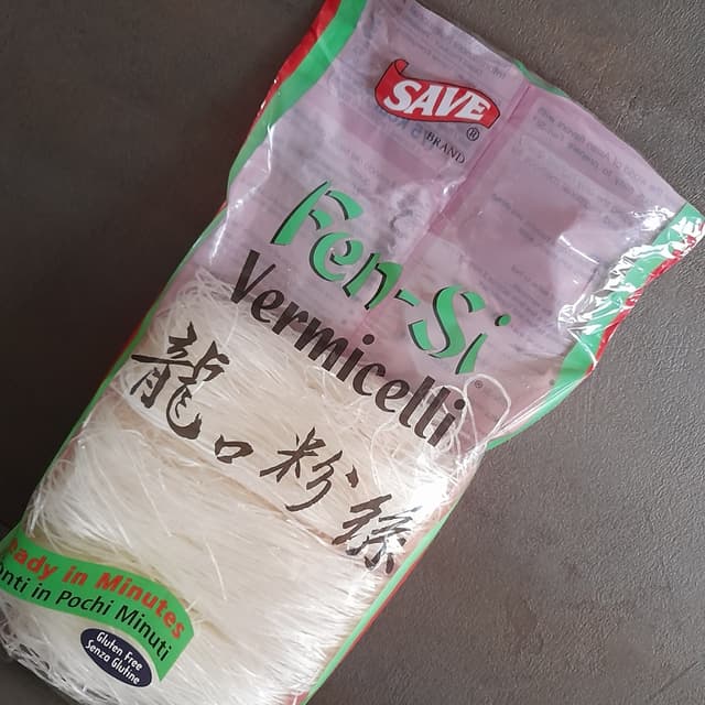Li ho comprati credendo che fossero degli spaghetti di riso, invece sono fatti con amido di fagioli mung, amido di piselli, amido di mais e acqua. Comunque l'effetto è lo stesso degli spaghetti di riso cinesi.