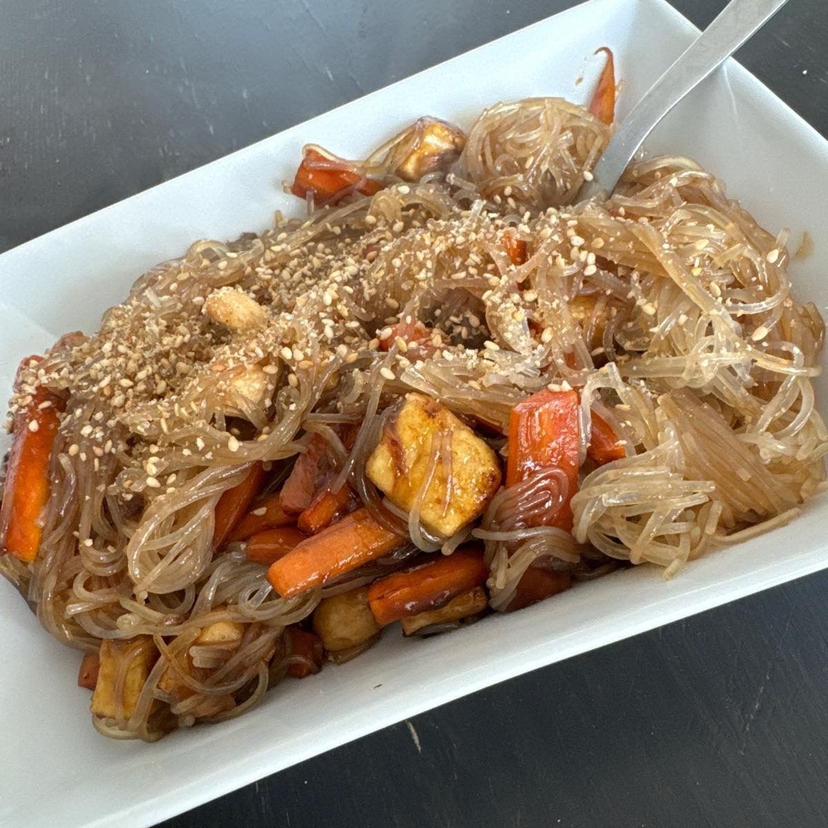 Questi Glass noodles sono la vita. Si cuociono in 3 minuti in acqua bollente, si risciacquano nell’acqua fredda e si tagliuzzano prima di unirli al condimento (qui carote, tofu e anacardi in agrodolce). Uno dei miei piatti prefe