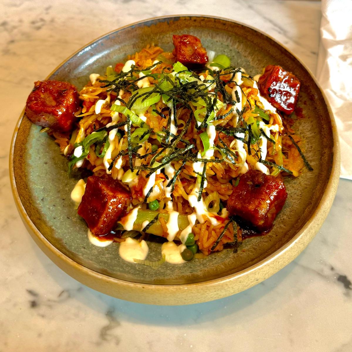 This was listed as kim chi fried rice, salt and pepper organic tofu, sweet gochujang chilli dressing, garlic aioli, shredded nori