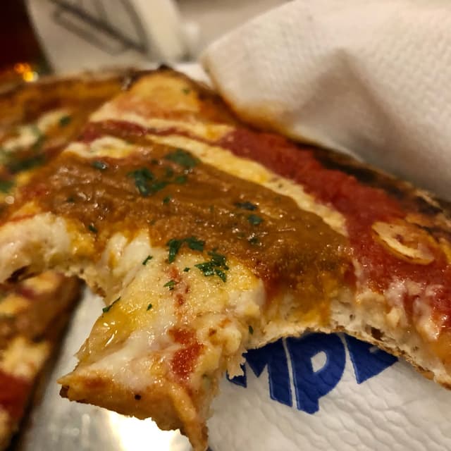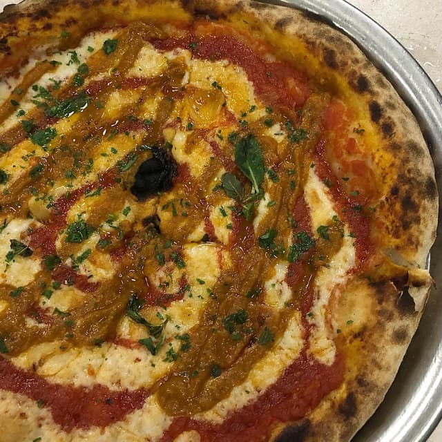 La que me pedí yo es con quesofu, salsa de tomate con pesto trapanese. En su momento ni me percaté y no le di bola al pesto. Tuve que googliarlo para hacer la review. Es un pesto a base de almendras y pistachos.