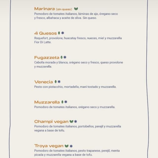 Y en cuanto a pizzas hay 4 opciones apta vegan: de jamon y queso a base de tofu/ marinara sin queso / con portobellos y quesofu.