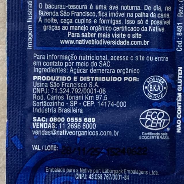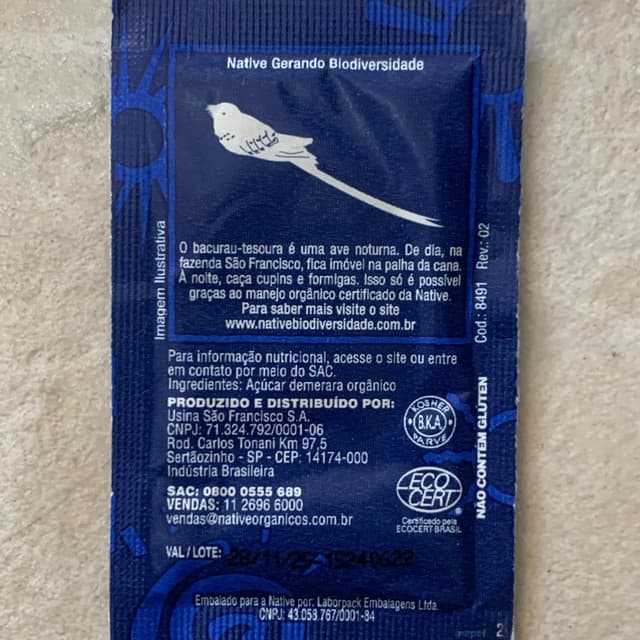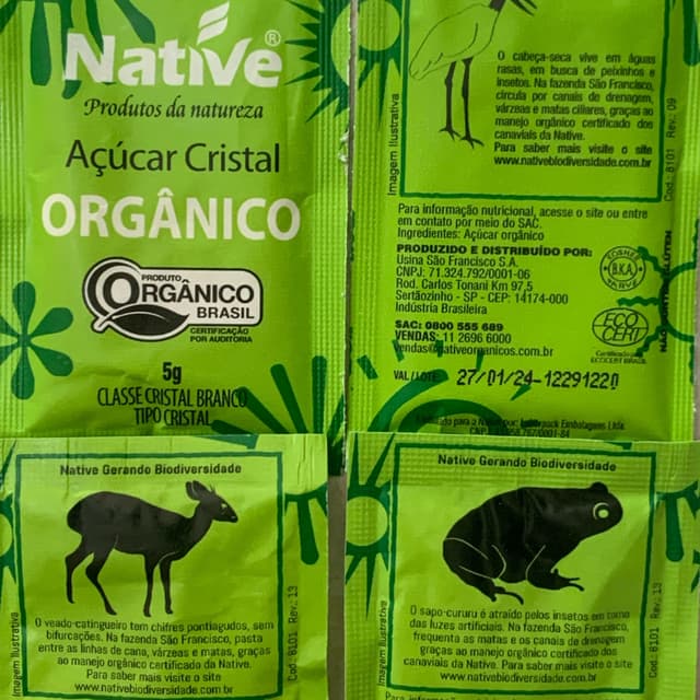 Por meio de tecnologia moderna aliada a práticas agrícolas naturais, como manejo orgânico regenerativo, controle biológico de pragas e colheita sem queima, a Native mantém intacta a qualidade de seus produtos da linha de açúcar, garantindo pureza e essência do mel de cana direto para sua mesa, respeitando você e o meio ambiente . A embalagem do açúcar orgânico retrata alguns animais da fauna brasileira encontrados em nossas fazendas certificadas, representando a biodiversidade alcançada na produção orgânica sustentável.