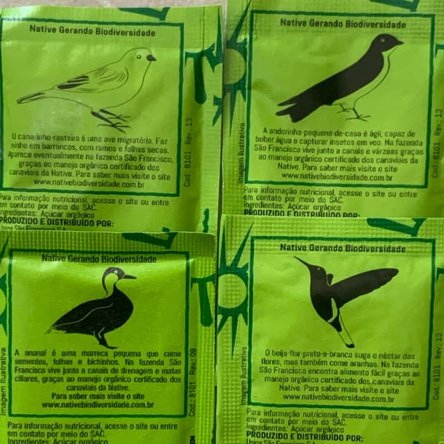 Todas as embalagens de sachê trazem uma espécie animal com as suas características que habitam a Fazenda da Native; foram identificadas 340 espécies de mamíferos 🐺, aves 🦅 , répteis 🦎 e anfíbios 🐸 , sendo 49 em extinção.