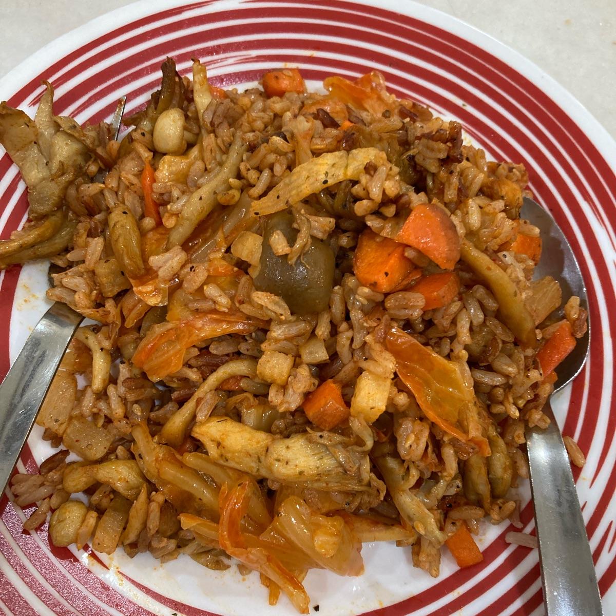 The best kimchi fried rice ever served from Fulfilling’s kitchen!!! Creativity juices flows in my head-KimChi Fried Rice! Chef K famous air fry Shimeiji mushrooms, cubed carrots 🥕 deliciously sea salted, rice bran oiled, white pepper, generous serving of dried herbs 🌿 skillfully mixed with love ❤️ boom! DELICIOUS 😋! Chef S made the perfect rice! Measure the water to perfection intuitively- the rice is cooked perfectly and the grain stand alone- allowing the Kimchi sauce to coat each and every grain beautifully! Next Chef Fulfilling mixed all in the wok over the lowest flame 🔥 & boom!