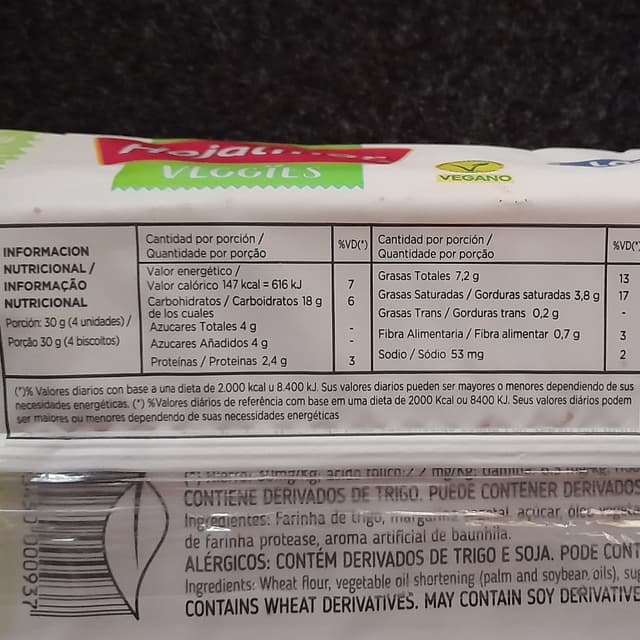 Tiene azúcares, tiene 2,4 gr de proteínas, tiene grasas excepto grasas trans, fibra alimentaria 0,7 gr, sodio 53 mg.