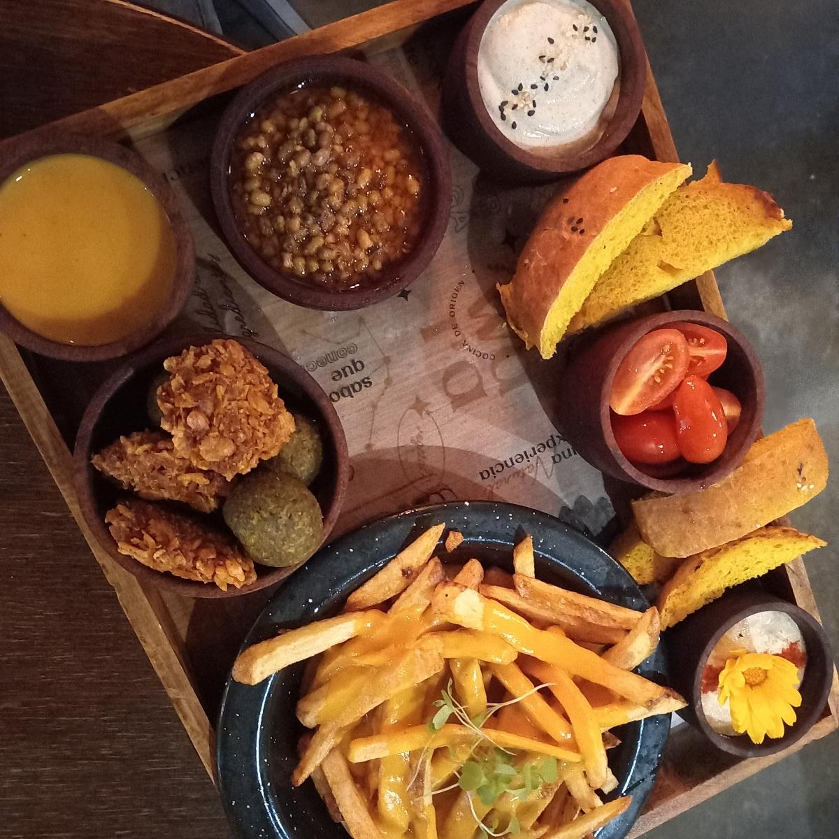 La verdad es algo que volvería a pedir mil veces. La única contra es que se supone que es para dos (Y el precio es prácticamente el de dos platos de la carta - casi $20.000 / Junio 2024), pero ni ahí comen bien dos personas con esas porciones (la cantidad de falafel/bocaditos de tofu, que son las opciones más "llenadoras", es escasa).