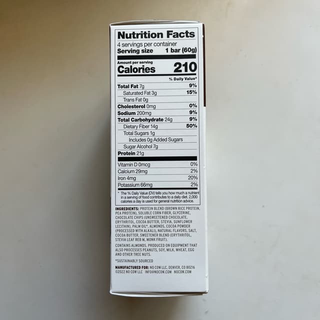 I find all of the classic No Cow products exceedingly dense — as though someone created a solid block of compressed #protein and #fiber. They definitely have the dryness to match, too. Though the cocoa flavor masks it somewhat, I wouldn’t recommend this #bar to anyone with sensitivities to sweeteners like stevia or sugar alcohols (#noaddedsugar,) or anyone who will be bothered by a bit of a protein aftertaste. These bars contain palm oil, too (claims to be sustainably sourced.)