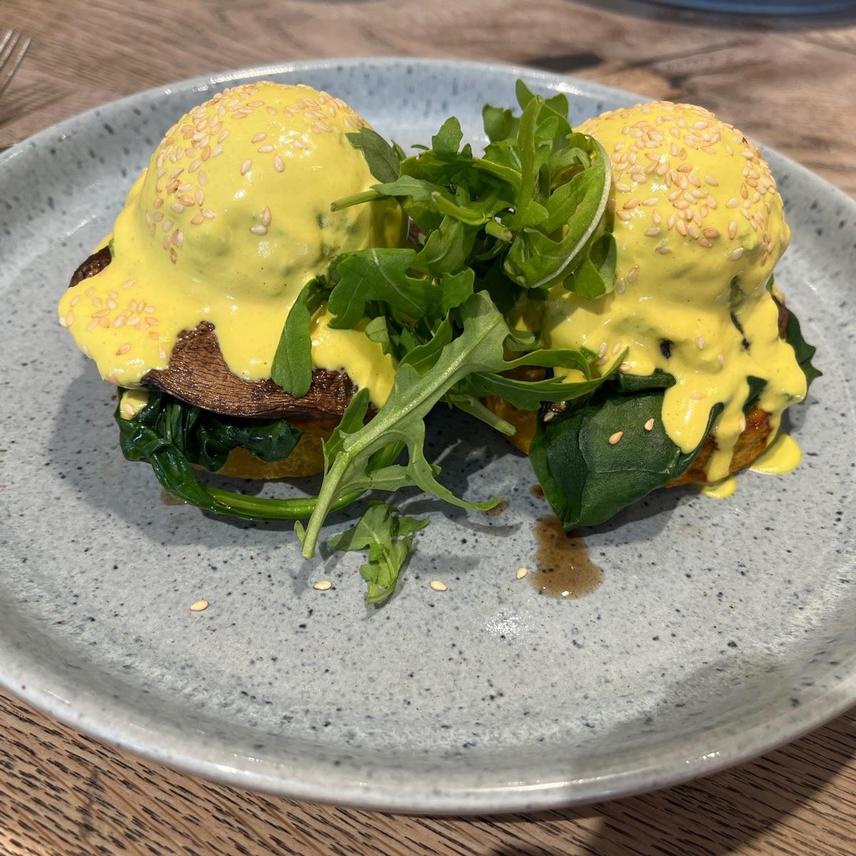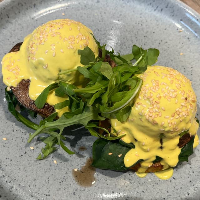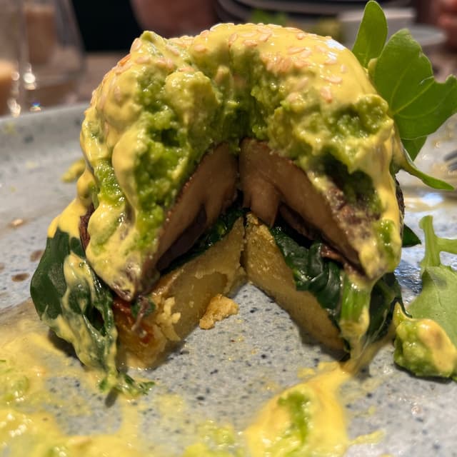 There was a #glutenfree protein muffin at the bottom that was quite crumbly. Then roasted #portobello mushrooms 🍄‍🟫on top of that with sautéed seasonal greens like #spinach 🌿on top. #eatyourgreens Then came the pea 🫛and #avocado #guacamole which was formed in a ball emulating the yolk. 🍳Last was the beautiful #hollandaise which I couldn’t really taste much of with all the other flavors going on in this. This felt really healthy and fresh and my partner preferred this dish of the three we tried. I enjoyed it but it was almost #toohealthy. Regardless I want to #saveveganrestaurants so you should check this place out. #veganlondon #londoneats