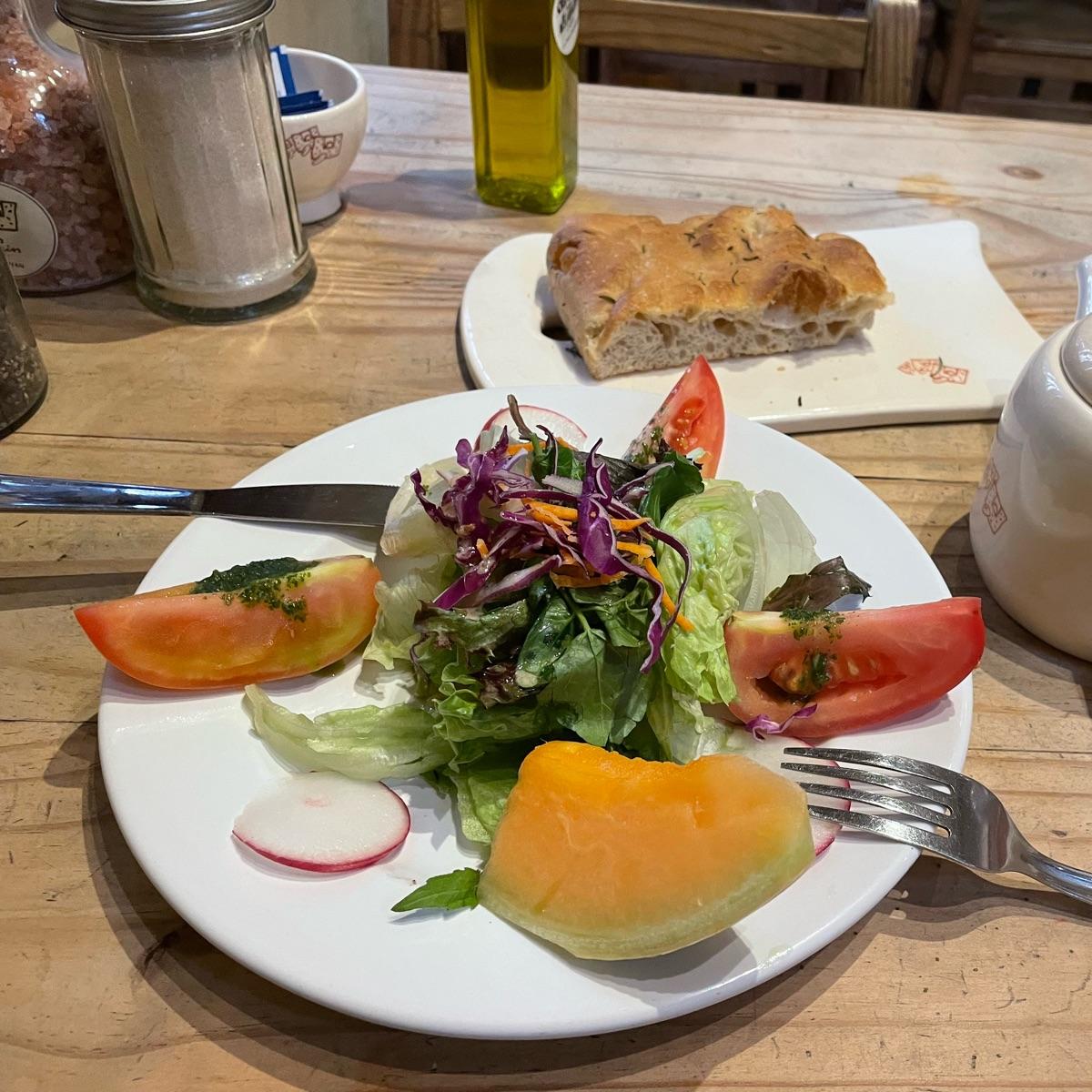 Salada de acompanhamento com alface , tomate , melão caipira, rabanete e pepino. Acompanha um molho pesto de manjericão muito saboroso. Para completar a refeição pedi uma focaccia de alecrim com sal grosso