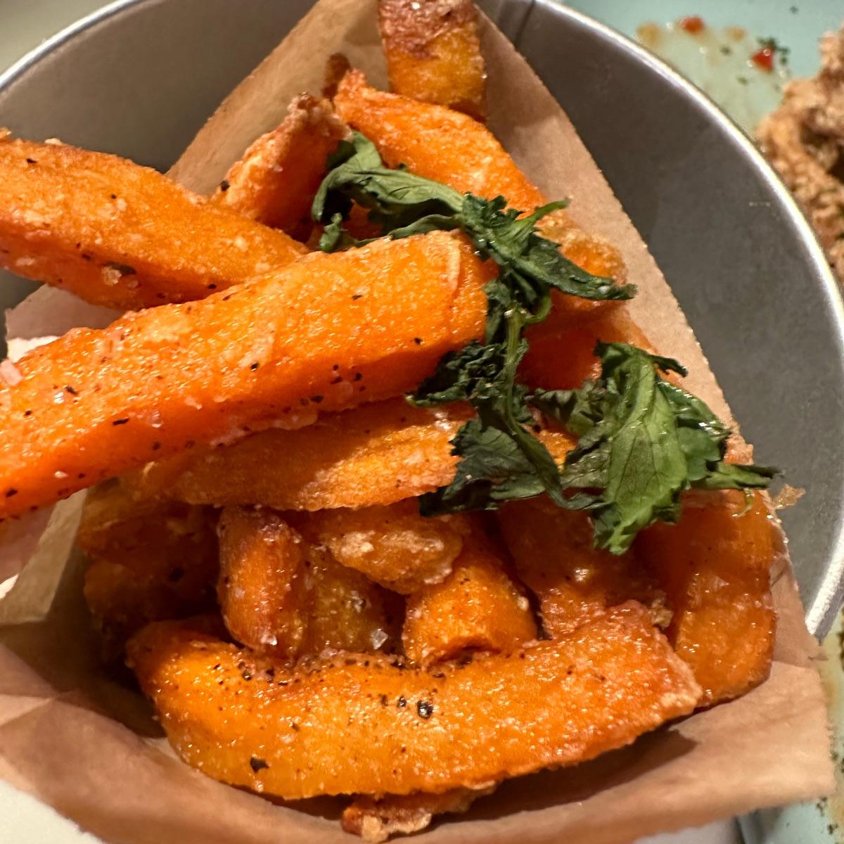 Sticks de boniato 🍠frito acompañado de ketchup de remolacha 4,5€No fue lo más destacable de la cena, pero mejor que unos edemames