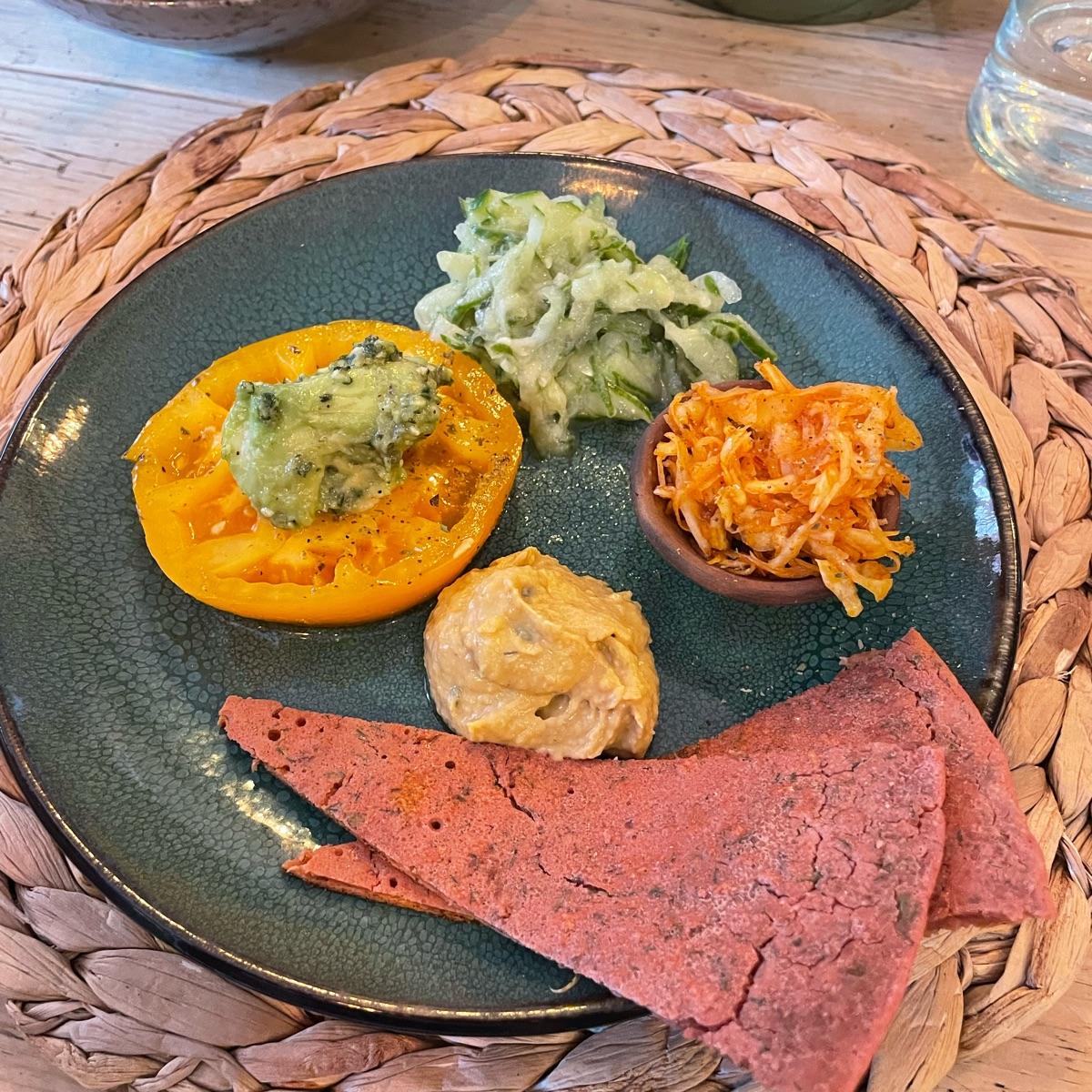This starter had a pesto guacamole on tomato, Smokey sauerkraut, dill soca bread, bean hummus and a cucumber tzatziki