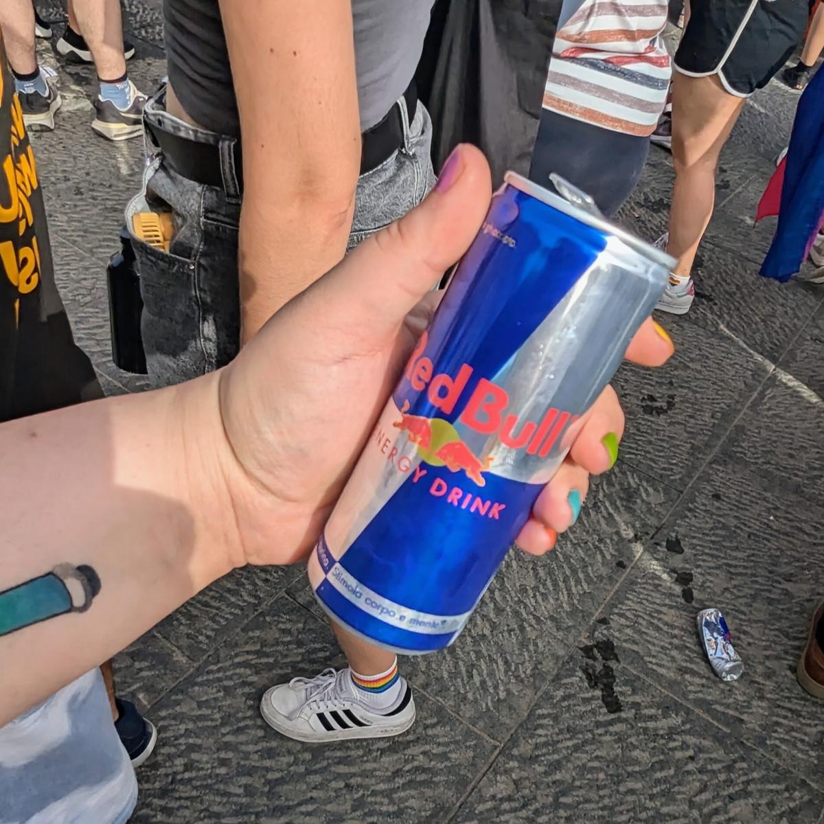 Me l'hanno regalata per strada, dalle macchine della Red Bull, bella fredda. Il tanto sonno e la prospettiva di camminare cinque ore sotto al sole, me l'hanno fatta trovare irresistibile.