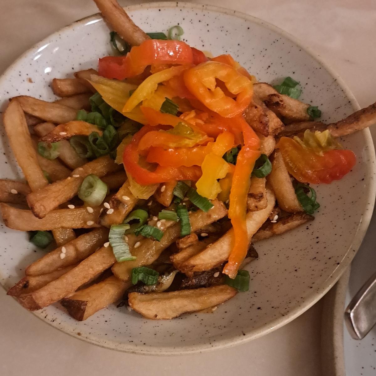Miso gravy, banana chilies, scallions, sesame seeds, chili oil.