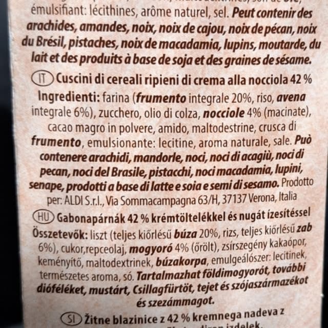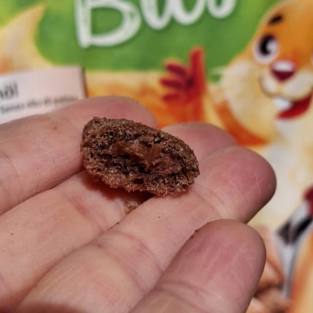 Cereali da colazione trovati da Aldi, non saprei dire se sono un prodotto fisso. Sono simpatici cuscinetti al cacao ripieni di crema tipo nocciolata. Essendomi tolta la curiosità di provarli ed essendo davvero troppo dolci non credo propria che li ricomprerò, ma a parte il fattore dolcezza non sono male.
