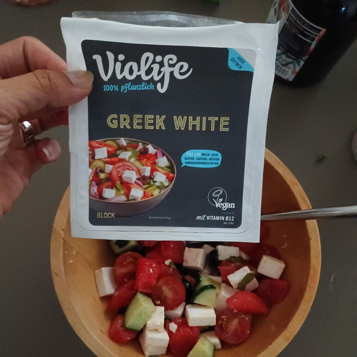Mi ensalada lleva: cuadraditos de Violife, olivas negras, hojas de menta, sandía, pepino y cherry