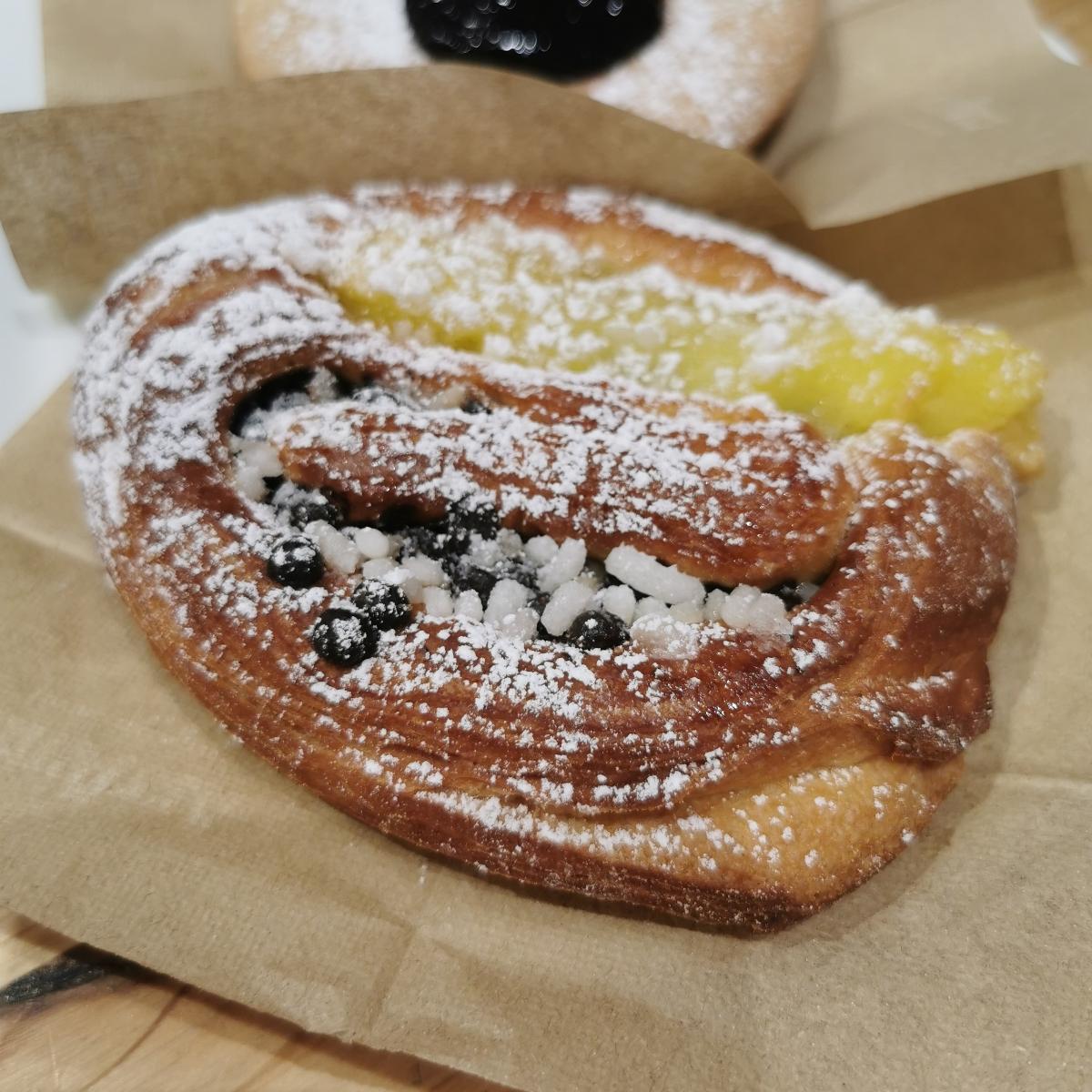Questa danese è fatta con la stessa sfoglia del ciavattone farcita per metà con gocce di cioccolato e per metà con crema pasticcera.