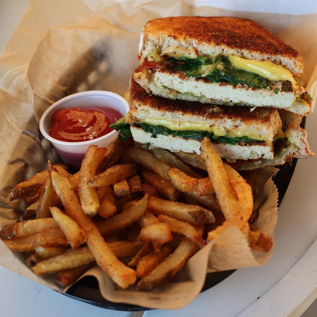 My photo is trash (excuse to order it again🤣🌿💚), but this was DELICIOUS! I think they may keep it on their menu, not just remaining on the specials. The sandwich had so much delicious goodness, including #dairyfree cheeze, grilled and blistered tomatoes, spinach, and grilled chicken. It was then smothered in the most delicious green goddess dressing. It had so much flavor. I definitely want to order the Green Goddess salad, as well. This is the perfect summer sandwich and paira nicey with their Zammy's fries. They have such reasonable prices as well, so another reason I love coming here. The owner is a huge dog and animal lover but brought my Ollie out some homemade croutons and he LOVED them. He's been asking us to go back!