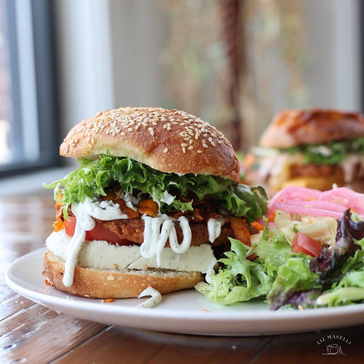 @twodollarradiohq does it again. Their burger week was INCREDIBLE! I really should have gone twice so I could try more. Erica and I split two burgers, and this was my favorite out of the two. The house-made dill havarti cashew cheese was just spectacular! I hope they add it to their menu permanently. (They are thinking about it) The Haus patty was also delicious. I believe it was made from soy and it was super juicy. This sandwich also had fresh lettuce, tomato, pickles, housemade ranch dressing, smokey 🥥 coconut bacon, and a sesame seed bun. I chose their house salad as my side! The burger was huge and super filling. I loved the different flavors and the added dill was perfect for summer. The dishes were a bit more expensive than normal but very reasonable considering. This plate was $16.