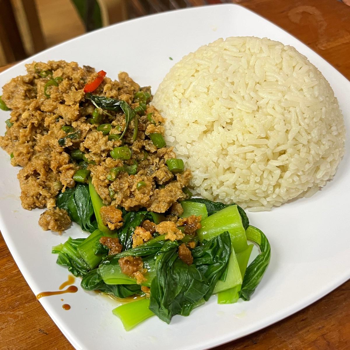 One of the best I have eaten. Very tasty and not overly salty. Love the thai basil leaves and bird's eye chilli in it. The mock mince made of soy had a good bite and absorbed the flavours well. Served with some sauteed greens. The rice was some sort of sesame oil rice. Good price at $5.80.