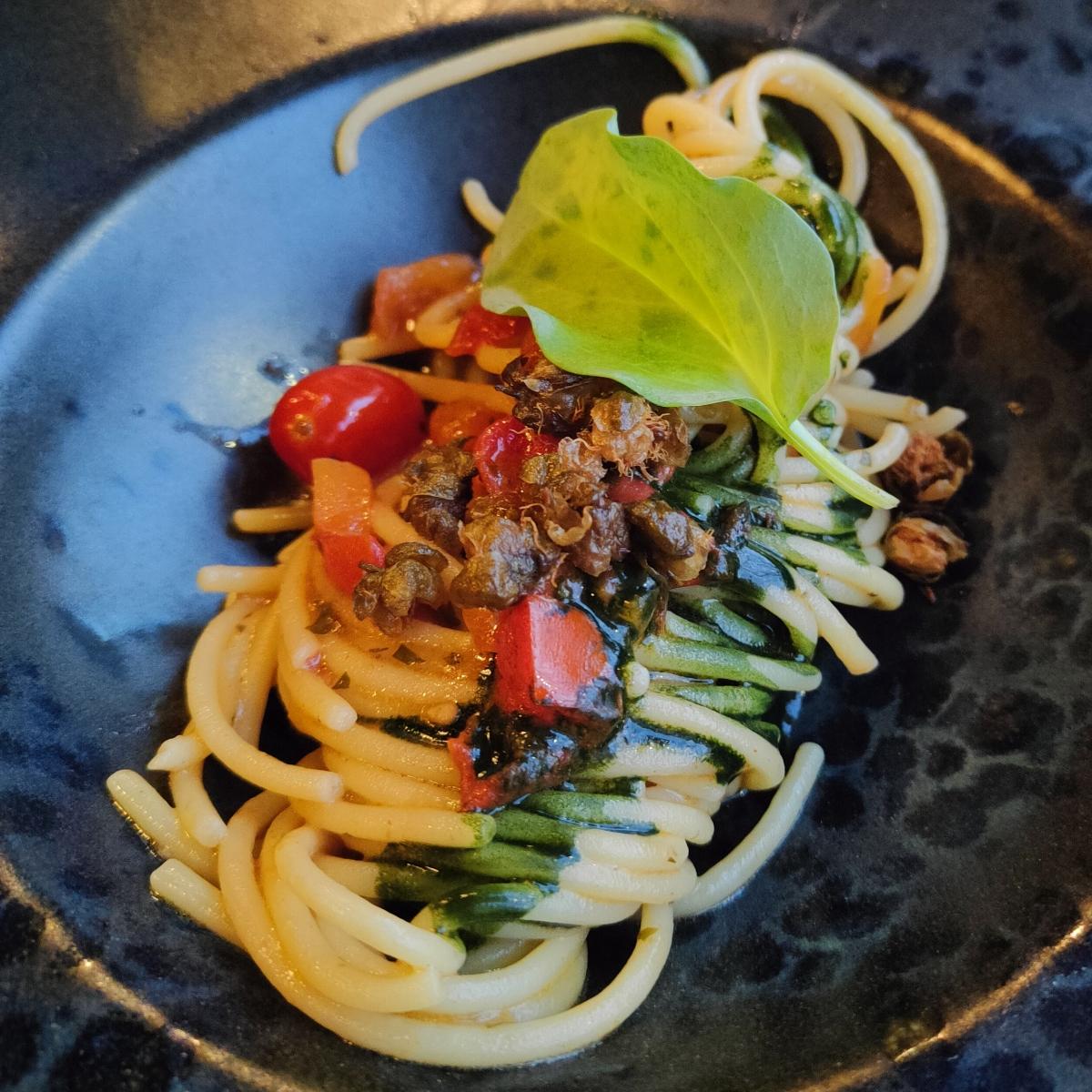 Il nome è bellissimo per questo piatto composto da spaghetto di Gragnano con pomodorini del Piennolo, fitoplancton marino, foglia d'ostrica e capperi croccanti.