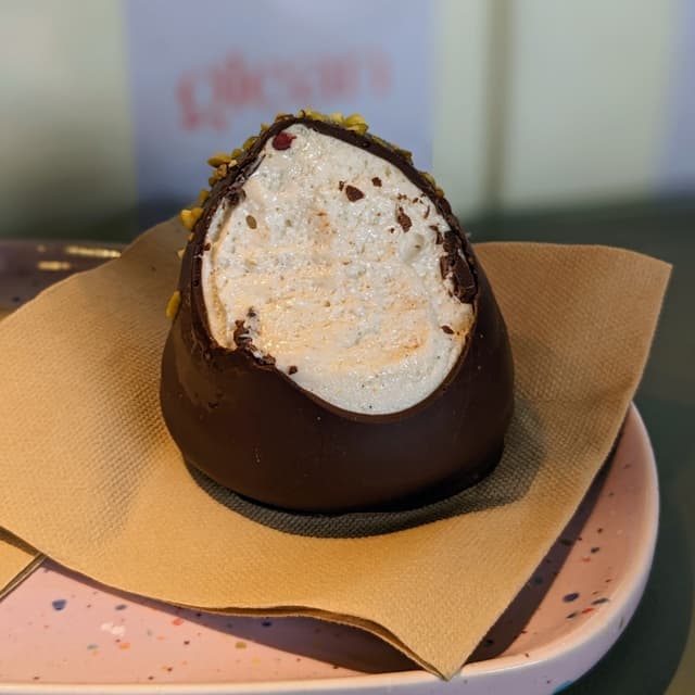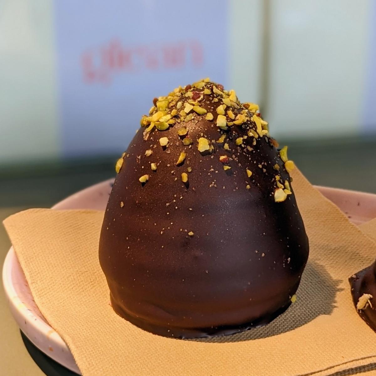 Fluffy aquafaba marshmallow mousse flavoured with refreshing passionfruit, atop almond marzipan base, encased in 70% dark Belgian chocolate crackling shell topped with chopped pistachio nuts. 💛🍫 The savoury nutty aroma helped to balance out the sweetness. Happy to try a vegan version of a classic Danish dessert! Swipe right ➡️ for a pic of the cross-section~ 📸 Would recommend getting this when you're at Torvehallerne Food Hall (Nørreport station)! 🚂 (DKK 30 for 1 piece, DKK 112 for 4 pieces) #denmark #copenhagen #dessert #glutenfree #womenowned