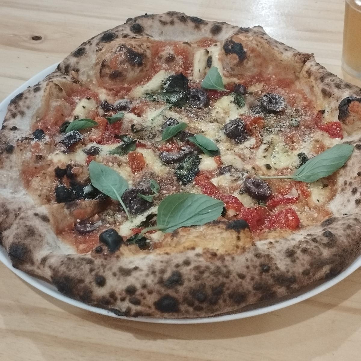 Molho de tomate, pimentão refogado, queijo (bom), azeitona preta e manjericão