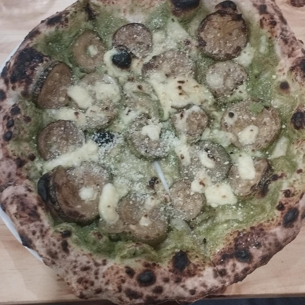Pesto de rúcula, abobrinha frita, parmesão A pizza é gostosa, mas, comparando com os outros sabores que eu experimentei, é um pouco sem graça