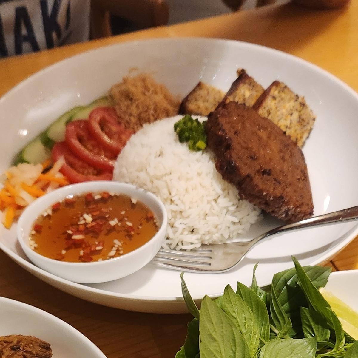 Very tasty and unique dish. The BBQ patty glaze and texture wonderful. The floss added something special. The cake was something I had never seen before and was tasty. Enjoyed this
