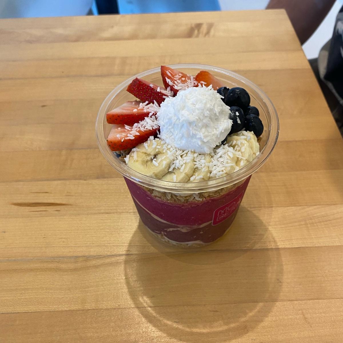 ☔️ Purple Rain bowl at Moberi consists of Acai, Pitaya, Blue Chia topped with Granola, Banana, Strawberry, Coconut, and Coconut Whip. 😋 🥥 🌴