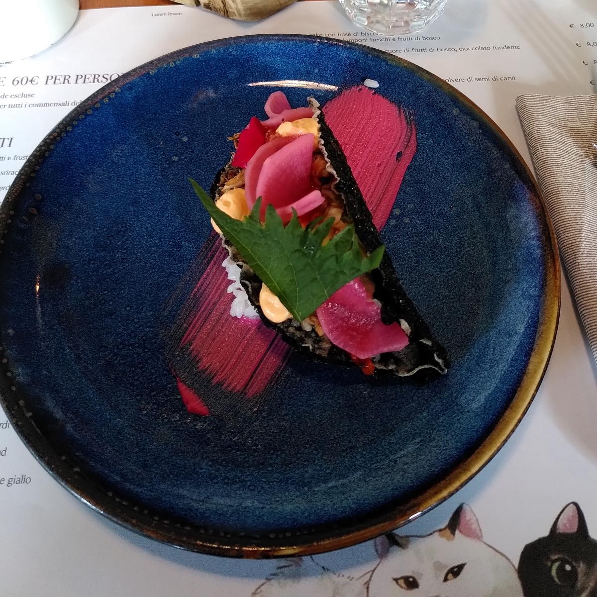 Ottimo antipasto! Il "taco" è fatto di alga, ripieno di riso del sushi e jackfruit marinato con maionese al sriracha, leggermente piccante