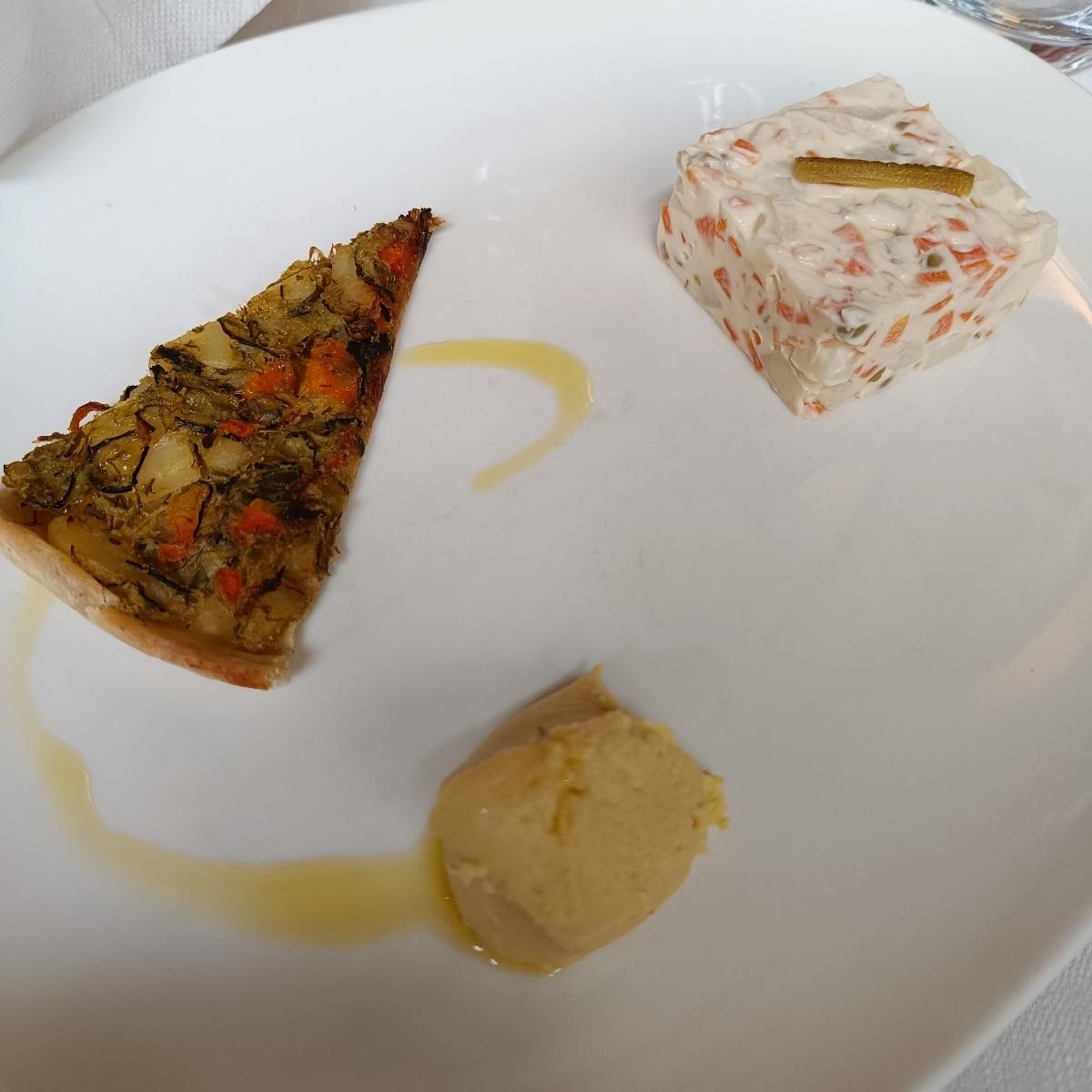 Tris di antipasti: insalata russa molto fresca, cremosa e delicata; torta salata di verdure di stagione ed erbe aromatiche, fantastica 😍; crema di cicerchie, buonissima 💚