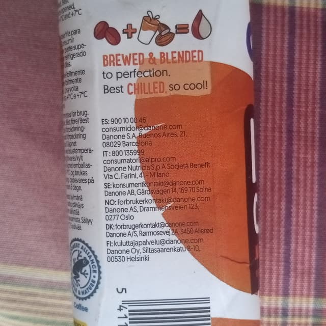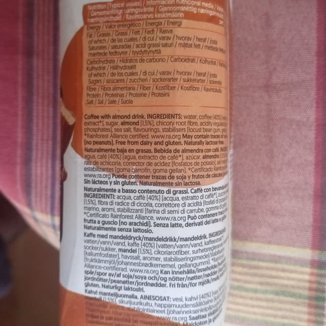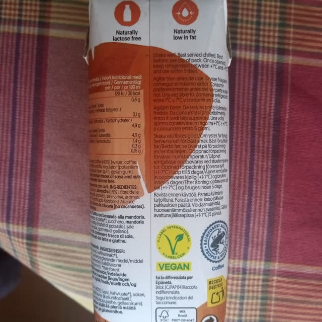 Café helado con leche de almendras, aunque almendras lleva muy pocas. No hay descafeinado, así que por probarlo estuve en vela hasta las 3 de la mañana... De todos modos, ya era hora de que ofrecieran alternativas respetuosas con los demás animales en este ámbito. Siempre los mismos cafés con fluidos mamarios de rumiantes en las baldas de los supermercados. Espero que se popularicen y dejen de servir los otros.