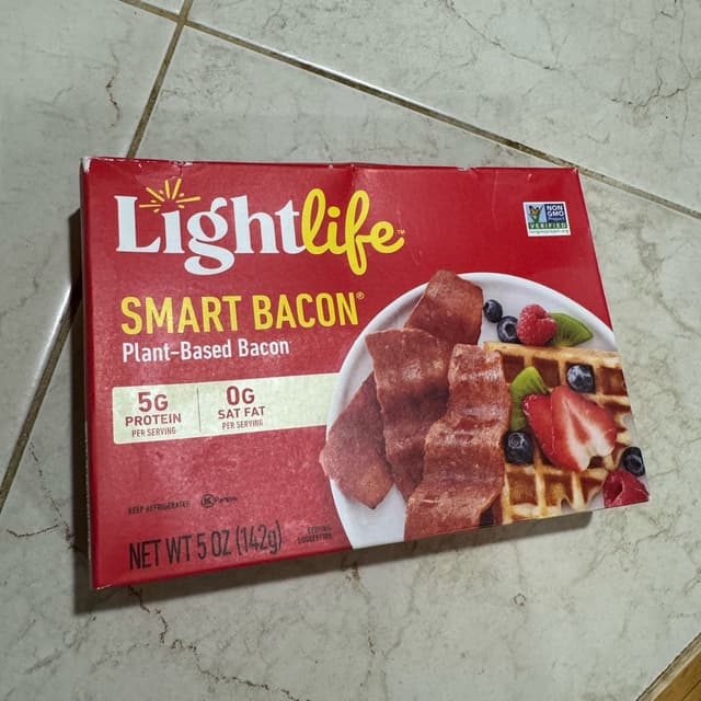 Lightlife smart bacon has become my go to bacon. it is easy to cook in the skillet in about three minutes. I think it has a great flavor and texture. I’ve found it’s helpful if you use a butter knife to separate the pieces. If you’re looking for a quick protein snack, add 2 tablespoons of peanut butter to some apple slices along with two slices of LL bacon (15g protein). #veganbacon #pigsarefriendsnotfood