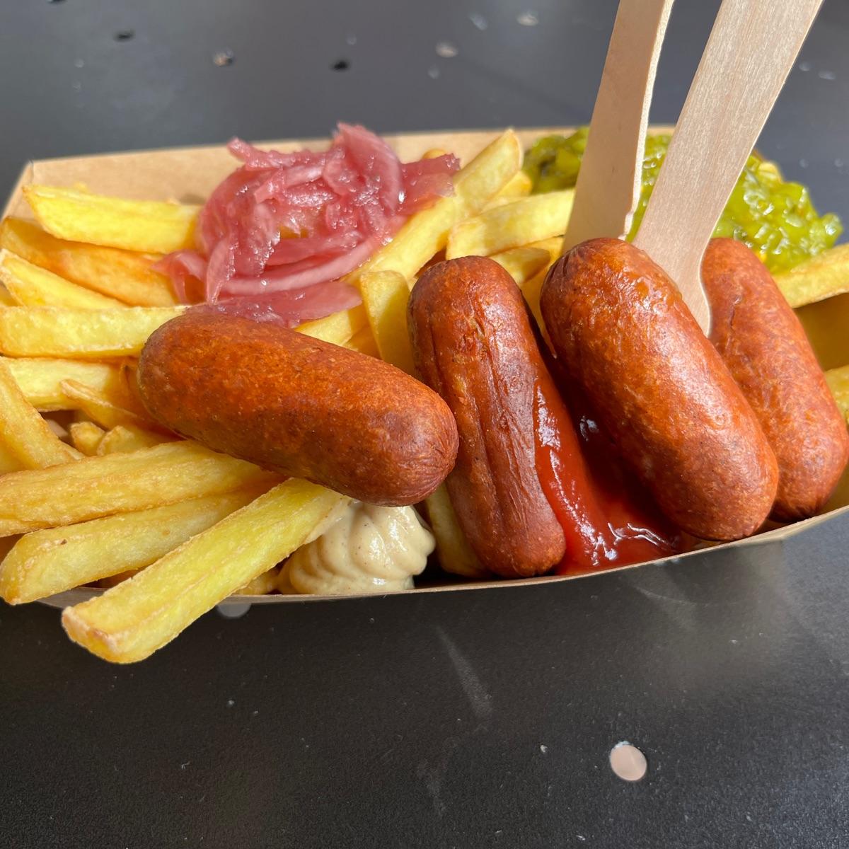 Joka kesä tämä on pakko syödä, vaikka onkin liian hapan kurkkusalaatti, mauttomat ja kuivat makkarat ja raakoja raneja. Kiva silti, että joka paikassa on vegeversio tarjolla!