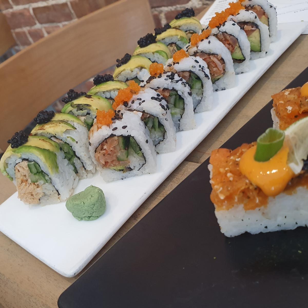 It has White rice, jackfruit crab, cucumber, charred avocado, and black truffle caviar
