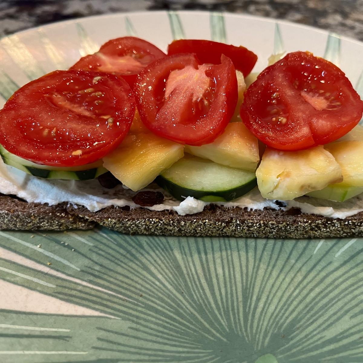 🇺🇸 As I’m in #florida we wanted to try to recreate this #sandwich from the Sanibel Cafe where we went every year when I was growing up. It was on a sweet dark #raisinbread with #creamcheese #pineapple #tomato and #cucumber. 🍍🍅🥒It’s a very unique sandwich that is usually closed. The bread we used wasn’t quite right but it was close. I got this plain Kite Hill cream cheese and it did the job. It’s made from #almondmilk and #livecultures so it’s surprisingly healthy. I’m very happy to finally try this brand and would love to try their other products. I’d get this again if I needed a plain cream cheese. It’s a bit pricey but quality usually costs. I managed to get my parents to eat another vegan meal with this, yes! 🎉🎊#dairyfree #ditchdairy #dairyisscary #glutenfree #soyfree #kosher #nongmo #bpafree