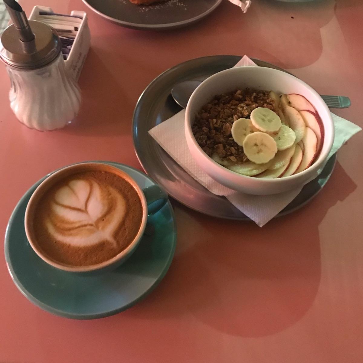Rico combo de café con leche vegetal y bowl de chía con fruta.