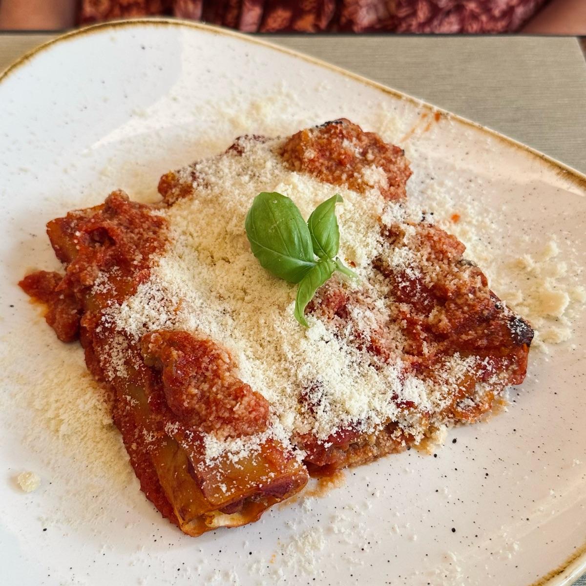 Pasta al horno rellena de boloñesa vegana de soja y Beyond con queso por encima. Aunque es un plato básico, está bien hecho y tiene buen sabor 😊#santuariovacaloura