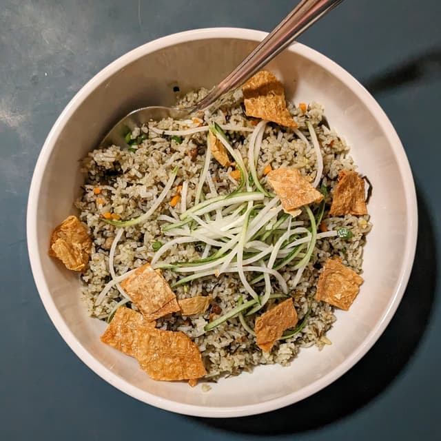 Nice savoury olive fried rice topped with finely minced #omnifoods 'meat' (so fine that it was a tad challenging to find 🙈), chopped French beans, shredded cucumber, and crispy fried 'goose' bits. 🍚🫛🥒 Ordered the vegan version without egg; personally would have liked some diced tofu or shredded yuba beancurd skin etc as replacement for more flavour and protein! 🍳 Overall still quite tasty though, and also not too greasy! ($8 small, $12 regular pictured, $22 large) #sgvegan #chinesefood #alliumfree #womenowned