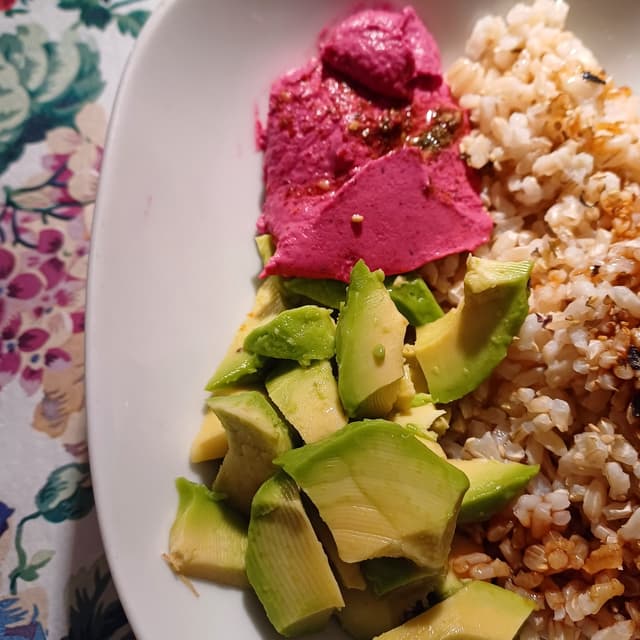 Ricetta dal Mondo di Cucina Esselunga: hummus color violetto fosforescente ma buono, con la componente dolce della barbabietola equilibrata dall'aglio e da tante spezie tra cui quelle della miscela za'atar (timo, sesamo, maggiorana, cumino, finocchio....). Cremoso e saporito, l'ho apprezzato in un tricolore con riso integrale e avocado 🟣⚪️🟢.