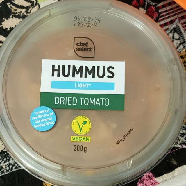 Un buon hummus, meno grasso di quello normale. Il pomodoro secco lo sento poco, ha una nota acidula di aceto molto prominente che non me lo fa utilizzare come al solito per condire la pasta.