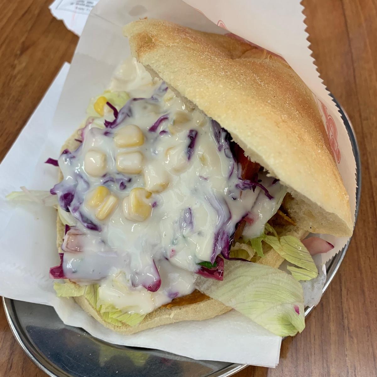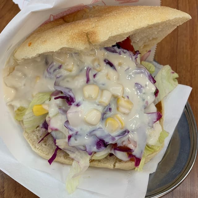 Cenamos aquí y yo pedí el Vegan Seitan Döner. Llevaba seitán, lechuga, remolacha, cebolla roja, maíz y salsa. Estaba bien.